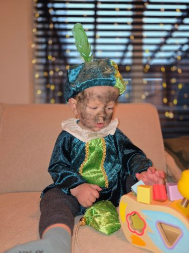 Hier showt Jelle voor ons het volgende pietenpak: kinderpietenpak met broek.