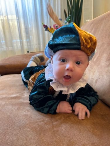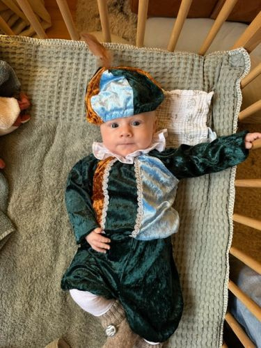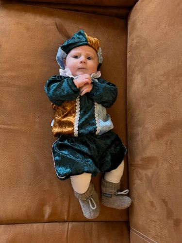 Hier showt Sem voor ons het volgende pietenpakje: babypietenpak met broek.