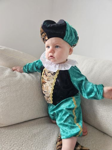 Hier showt Ky-Mani voor ons het volgende pietenpakmodelletje: tijgerpietenpak met broek.