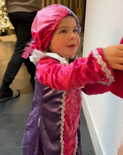 Laura is hier 2 jaar draagt normaal maat 98, zij heeft het jurkje iets ruimer besteld maat 110 daarom nu wel te groot. Maar zo heb je er extra jaren plezier van.